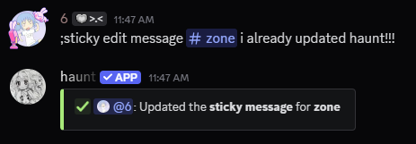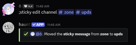 sticky edit message command to switch the message for that channel.Example on how to edit sticky message channels