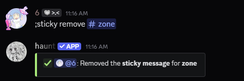 Remove a sticky message from a channel by using thesticky remove command.