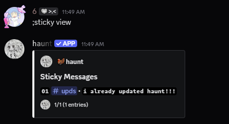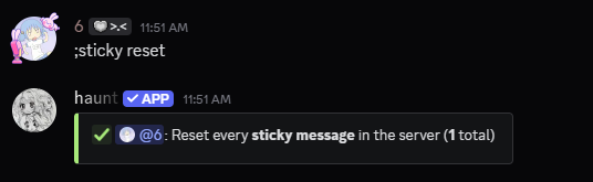 ;prefix set [character]to change the prefix for your server.Keep in mind that haunt will not send the sticky message if another bot sends a message.