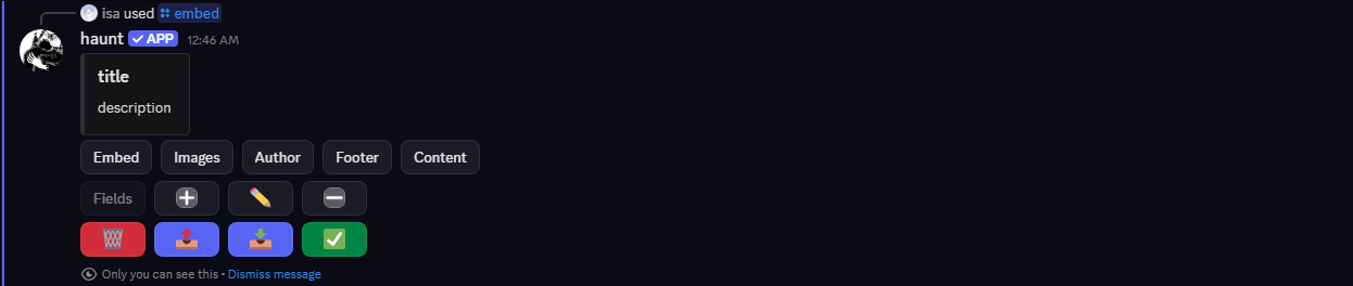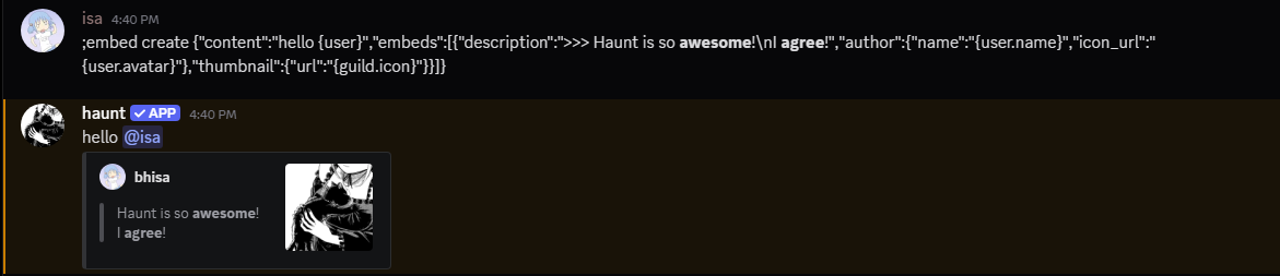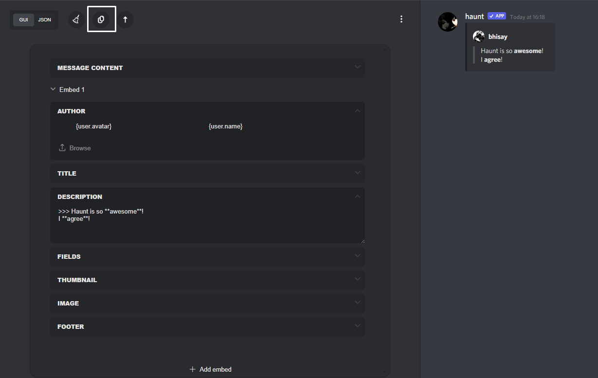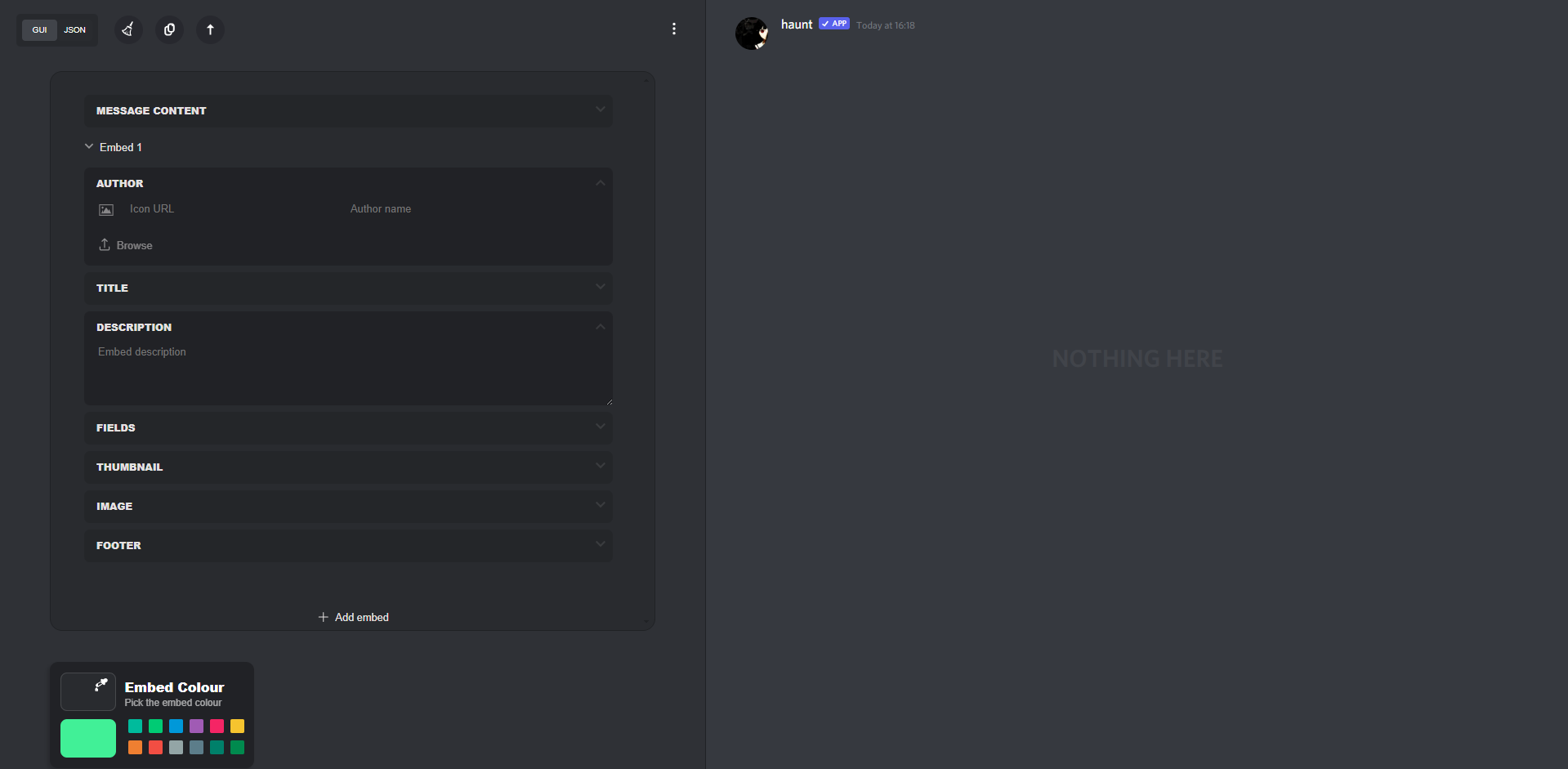 To create an embed, you can create one via haunt’s embed creator, this will also show a live preview of how your embed would appear in Discord.