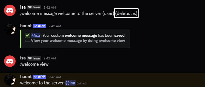 {delete} | Delete a message after a certain duration | {delete: 1m30s} |